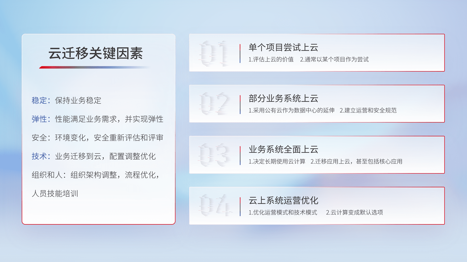 结合实际业务,,,从规划设计、、、、云平台选型、、、云原生改造、、、、数据迁移、、、、集成交付,,,迁移全过程为客户识别最佳上云路径,,,,做好风险识别管理,,,设计网络架构、、、、身份权限、、、、安全审计合规、、、、操作审计、、、、日志审计、、监控告警策略、、、、多站点容灾设计等,,对云上基础设施进行整体规划,,提升IT治理水平,,以满足弹性、、高可用、、高性能的需求。。。。